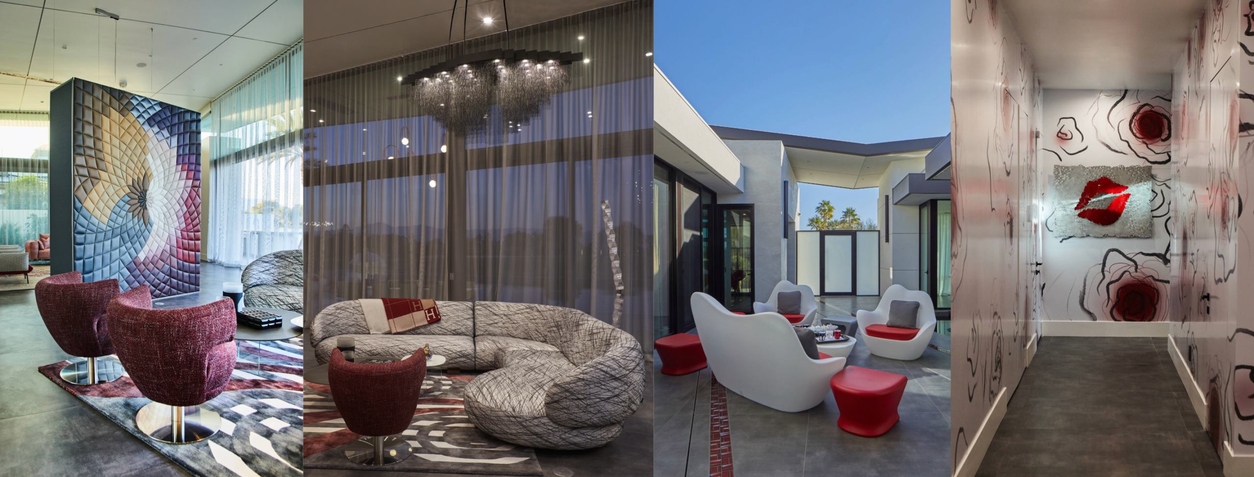 Her designs are built from the ground up. Handcrafted. One of a kind masterpieces. Take the project Rancho Mirage for example, with the chainmail chandelier, hand painted acrylic finished roses from floor to ceiling, and the signature leather flower wall made from 443 individual cut and stitched pieces! This private enclave is bold, empowering, and delicious at every angle.